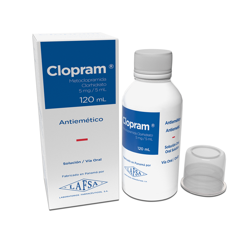 Clopram Antiemético Lafsa Solución Oral 5 mg/5 ml 120 ml es un medicamento indicado para el alivio de náuseas y vómitos de diferentes causas. Su presentación en solución oral facilita la administración y dosificación, especialmente en niños y adultos con dificultad para tragar tabletas. Contiene metoclopramida, que actúa ayudando a regular el movimiento del estómago y favoreciendo la digestión.