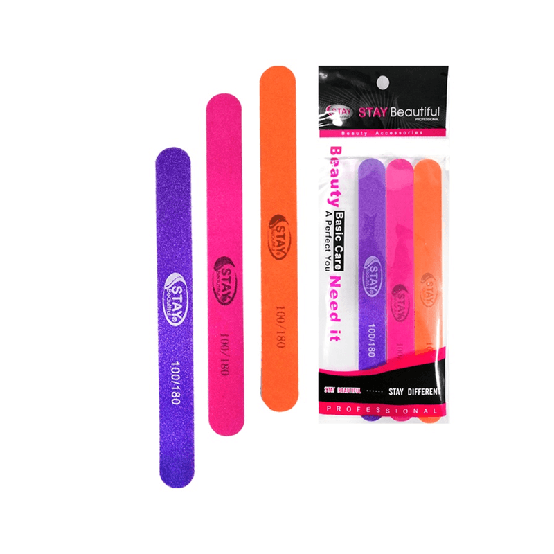 Estas limas de manicure Staybeautiful son perfectas para dar forma y suavizar las uñas con precisión y facilidad. Con una doble superficie de granos 100/180, permiten un limado efectivo para uñas más gruesas (grano 100) y un acabado suave y pulido (grano 180). Vienen en un práctico paquete de 3 unidades, ideales para uso personal o profesional. Su diseño compacto y resistente asegura durabilidad y un manejo cómodo, siendo un complemento esencial para tu rutina de cuidado de uñas.
